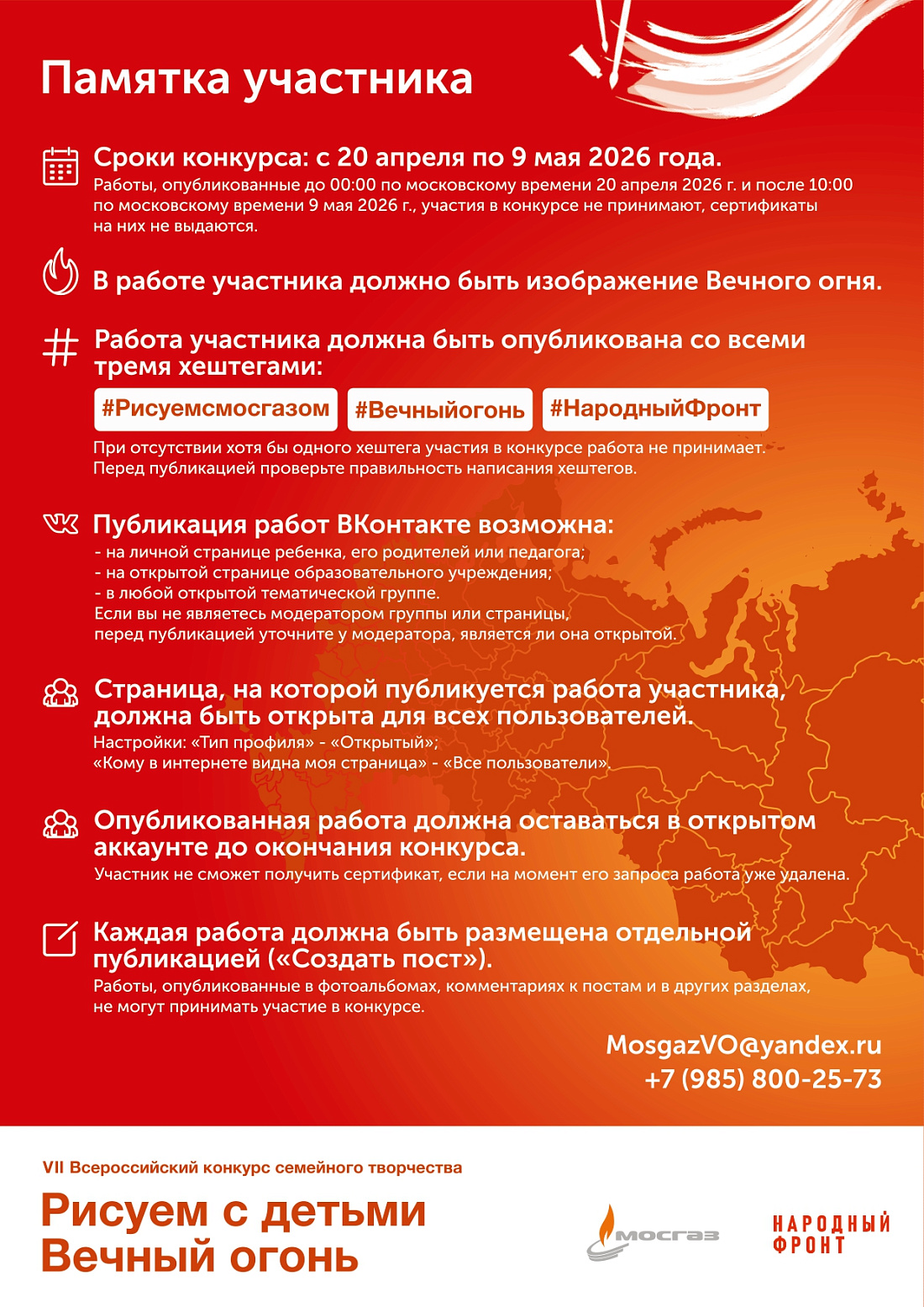 С 20 апреля по 9 мая 2026 года в рамках фестиваля юных талантов «Волшебная сила голубого потока — МОСГАЗ зажигает звезды» и акции Народного фронта «Вечный огонь в нашем сердце» проводится VII Всероссийский конкурс семейного творчества «Рисуем с детьми Вечный огонь».