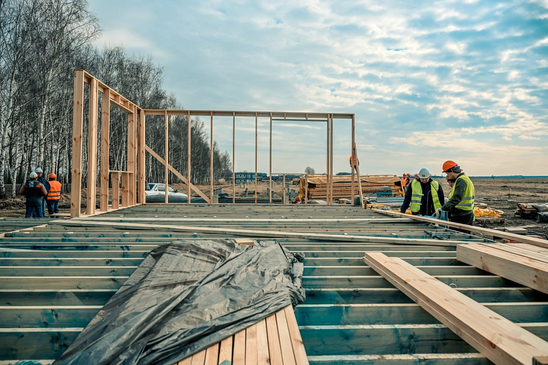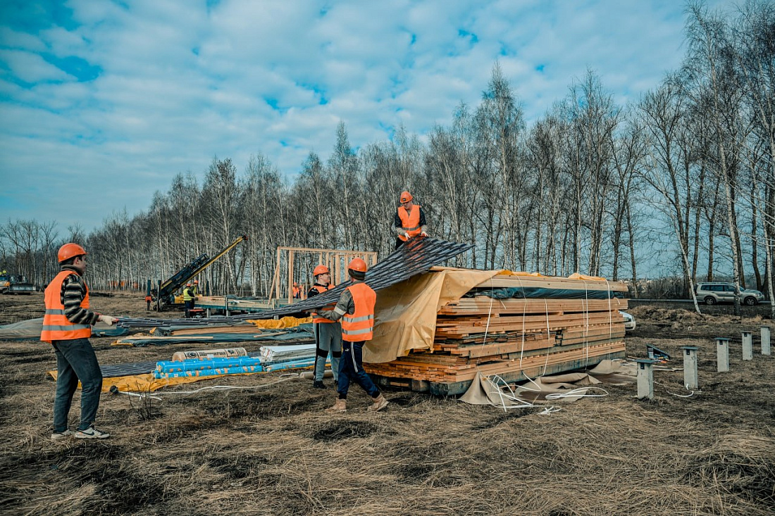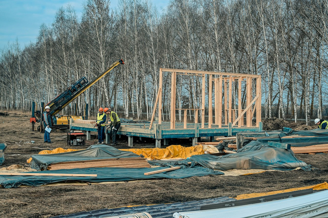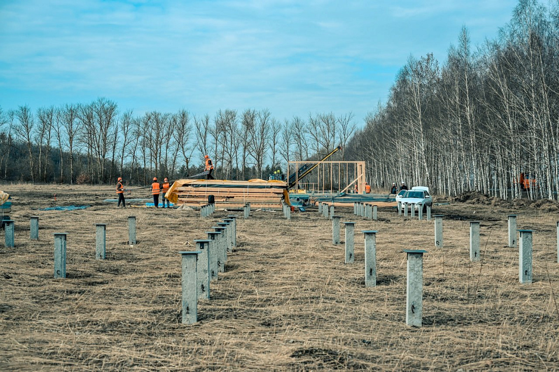 Подрядчик уже приступил к монтажу четырех демонстрационных домов разной площади. Для размещения конструкций обустроены свайные поля, подготовлены необходимые материалы. Дома строят по каркасной технологии, с полной внешней и внутренней отделкой с использованием экологичных и безопасных материалов.